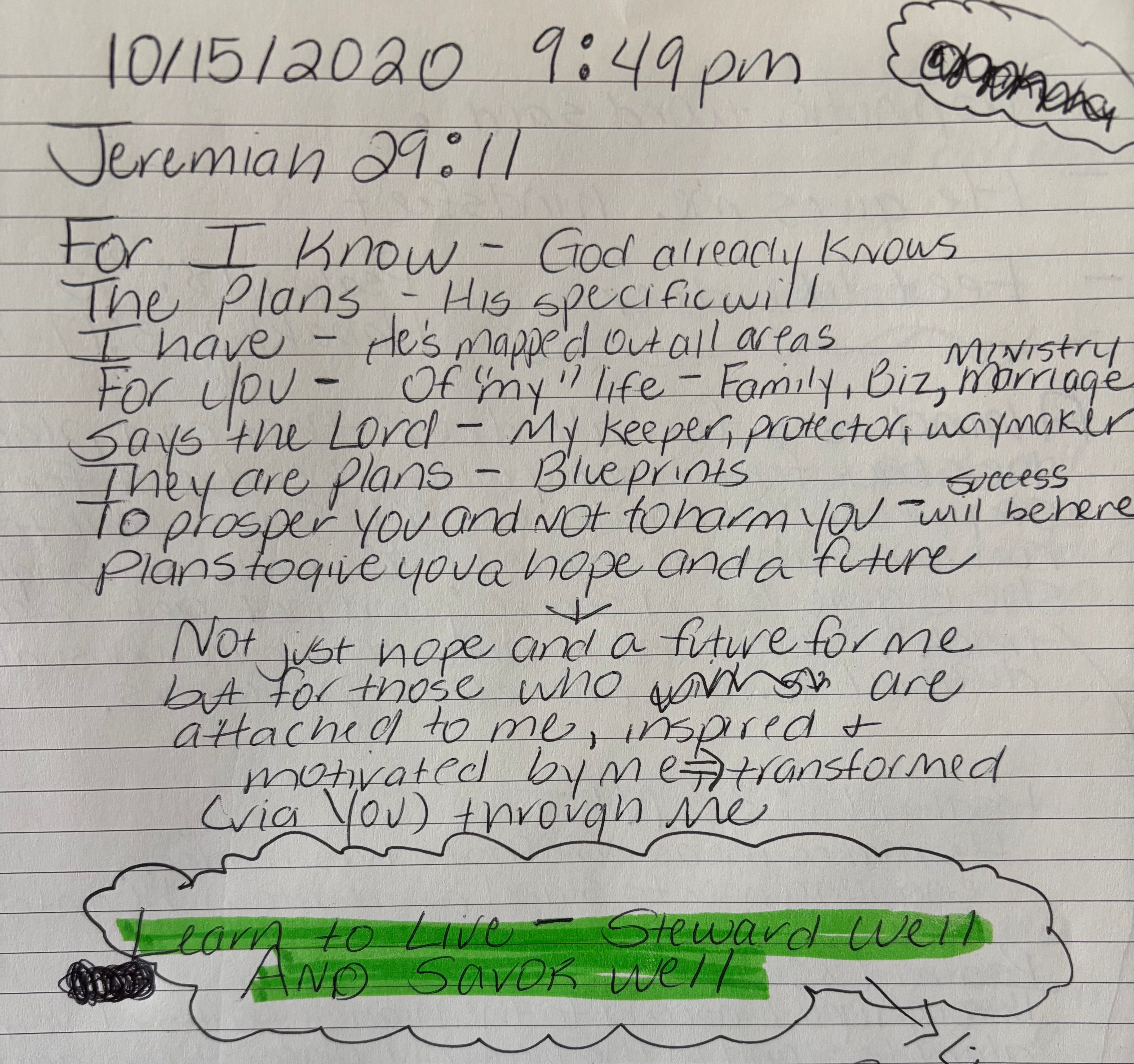 In 2020, while living in Fort Lauderdale, I began journaling Scripture during my quiet time. I was wrestling with the unknown. I wanted clarity, especially around the plans for my life. I had desires in my heart and prophetic promises spoken over me, and what I really wanted was a neat, practical download outlining my next steps.
